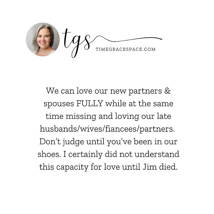 We can love our new partners & spouses FULLY while at the same time missing and loving our late husbands/wives/fiancees/partners. Don’t judge until you’ve been in our shoes. I certainly did not understand this capacity for love until Jim died.