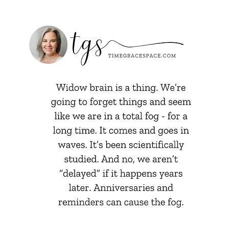 Widow brain is a thing. We’re going to forget things and seem like we are in a total fog - for a long time. It comes and goes in waves. It’s been scientifically studied. And no, we aren’t “delayed” if it happens years later. Anniversaries and reminders can cause the fog.