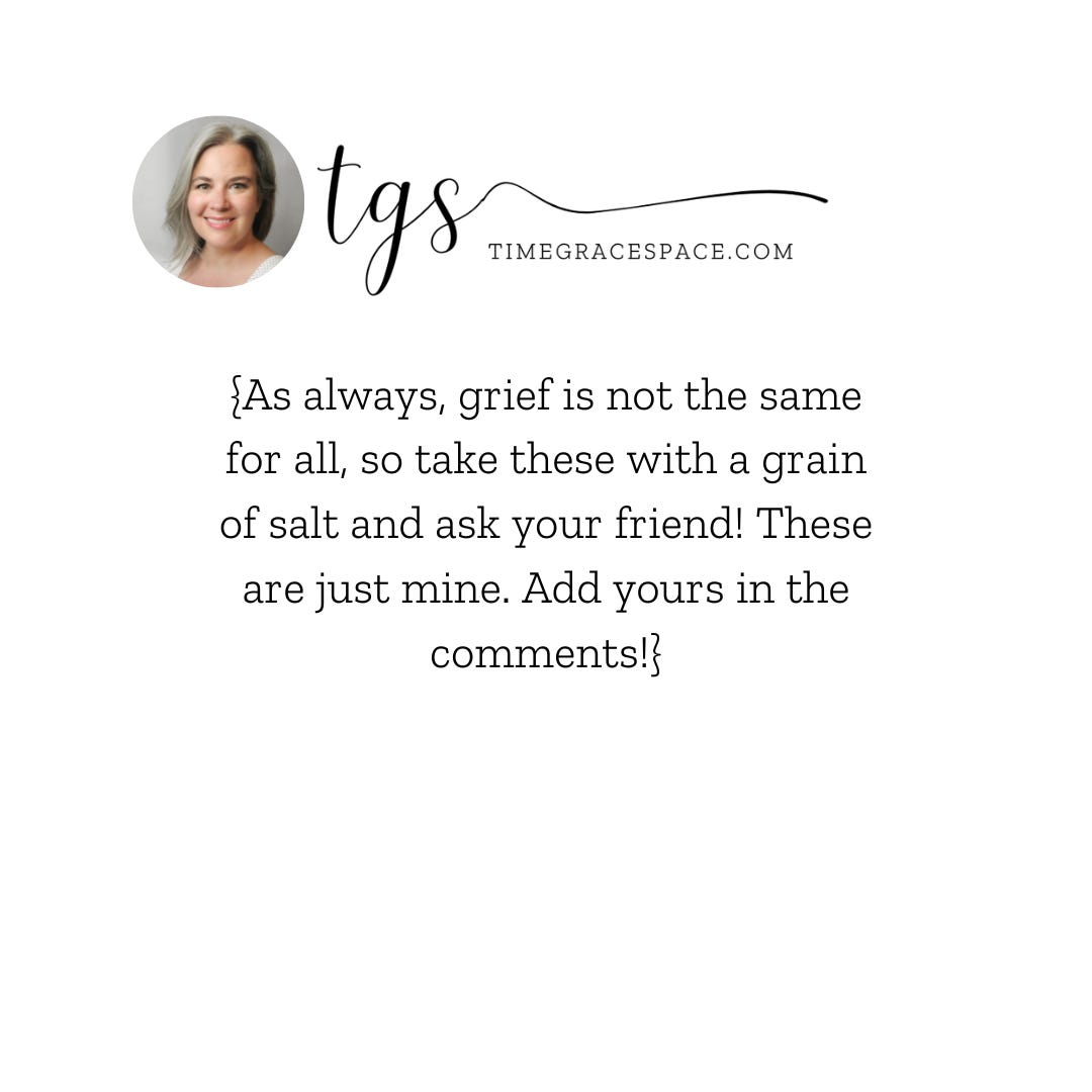 {As always, grief is not the same for all, so take these with a grain of salt and ask your friend! These are just mine. Add yours in the comments!}