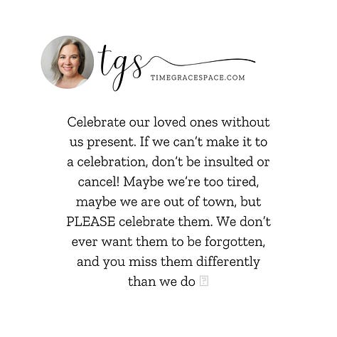 Celebrate our loved ones without us present. If we can’t make it to a celebration, don’t be insulted or cancel! Maybe we’re too tired, maybe we are out of town, but PLEASE celebrate them. We don’t ever want them to be forgotten, and you miss them differently than we do 💗