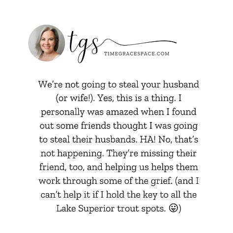 We’re not going to steal your husband (or wife!). Yes, this is a thing. I personally was amazed when I found out some friends thought I was going to steal their husbands. HA! No, that’s not happening. They’re missing their friend, too, and helping us helps them work through some of the grief. (and I can’t help it if I hold the key to all the Lake Superior trout spots. 😛)